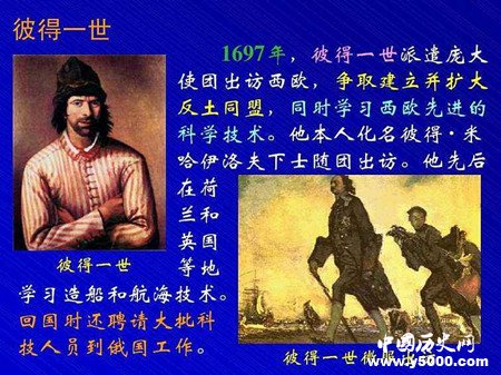 俄國與同時(shí)期的西歐相比十分落后。為了學(xué)習(xí)西歐的經(jīng)驗(yàn),1697至1698年間,彼得特意到西歐進(jìn)行了一次長(zhǎng)途旅行。旅行期間,他特意使用假名,這樣使他學(xué)到了更多的東西。他盡其所能,充分學(xué)習(xí)西方先進(jìn)的東西。他在荷蘭東印度公司當(dāng)過船長(zhǎng),在英國造船廠當(dāng)過工人,在普魯士學(xué)過射擊。他的足跡遍及歐洲的許多地方,比如學(xué)校、工廠、博物館等等。通過西歐之行,彼得一世受益匪淺,這為他的改革提供了寶貴的經(jīng)驗(yàn)。