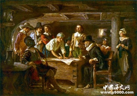 1620年9月,102名清教徒在領(lǐng)袖布雷德福的帶領(lǐng)下乘坐著木制帆船“五月花號(hào)”駛向自己夢(mèng)寐以求的美洲。他們冒著生命危險(xiǎn),經(jīng)歷狂風(fēng)巨浪,在茫茫大海上艱難前行。經(jīng)過(guò)兩個(gè)多月的艱難航行,他們發(fā)現(xiàn)了一塊陸地,便停船靠岸。他們當(dāng)時(shí)到達(dá)的地點(diǎn)是今天美國(guó)馬薩諸塞州普利茅斯港。