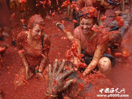 對(duì)于西紅柿節(jié)的由來,眾說紛紜。有的說是在一個(gè)小鎮(zhèn)上,一群年輕人在廣場(chǎng)上發(fā)動(dòng)了一場(chǎng)食物大戰(zhàn)。第二年他們?cè)俅蜗嘤觯忠淮位ハ嗤稊S起來,而且連周圍的路人也成了攻擊對(duì)象,這成了今日西紅柿狂歡節(jié)的由來。還有人說是,有一天,該城里一個(gè)小樂隊(duì)從市中心吹著喇叭招搖過市,領(lǐng)頭者更是將喇叭翹到了天上。這時(shí),一伙年輕人突發(fā)奇想,抓起西紅柿向那喇叭筒里扔,并且互相比試,看看誰能把西紅柿扔進(jìn)去,并由此引發(fā)了西紅柿節(jié)的誕生,而這一天正是每年8月的最后一個(gè)星期三,為此人們便將這一天定為西紅柿節(jié)。