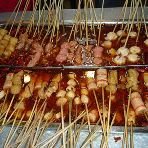 鹵水鍋置旺火上,使之保持小沸,將各類菜用串好的竹簽燙制,根據(jù)不同菜肴的火候燙制成熟。