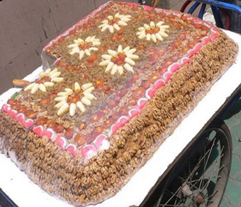 3、制作流程:新疆切糕先蒸熟,趁熱將它放進(jìn)一個(gè)很結(jié)實(shí)的木槽之中,再用一塊厚木板蓋上,再壓一些重物,也可以找?guī)讉€(gè)胖子站在上面。這樣切糕被壓的很緊實(shí),水份也隨著木槽底部的細(xì)縫流出。兩天之后,把重物移開(kāi),一塊結(jié)實(shí)的切糕就誕生了。
