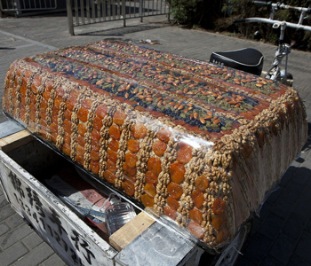 3、制作流程:新疆切糕先蒸熟,趁熱將它放進一個很結(jié)實的木槽之中,再用一塊厚木板蓋上,再壓一些重物,也可以找?guī)讉€胖子站在上面。這樣切糕被壓的很緊實,水份也隨著木槽底部的細縫流出。兩天之后,把重物移開,一塊結(jié)實的切糕就誕生了。