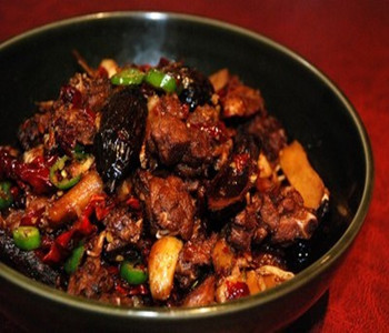 3、炒鍋燒底油燒至六成熱,下入剁椒、姜片大火煸至油紅,下鴨塊炒至變色,放入檳榔,烹料酒,放醬油、鹽、味精、高湯中火煨6分鐘至熟透,加入尖椒,裝入干鍋即成。