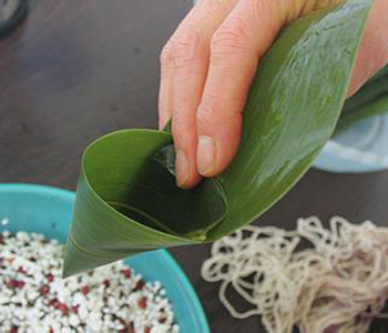 3、如果粽葉夠大,可以用一片粽葉把粽子包起來,先把兩面折起來,成條狀,然后再上下對折,把粽子包起來。手上稍微用點力,把粽子壓緊,然后用繩子捆好。