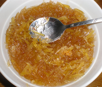 5、待柚子湯汁稍涼(約65℃)時(shí),放入蜂蜜拌勻(切忌高溫,因?yàn)楦邷匾灼茐姆涿鄣臓I養(yǎng)),裝入玻璃瓶或密封罐中,置冷藏室存放,喝的時(shí)候用溫水沖調(diào)效果更好。