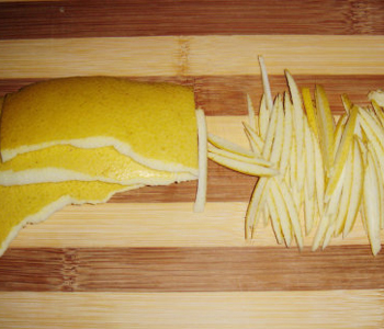2、將水分?jǐn)D干,然后削下黃綠色的皮(盡可能薄,越少白瓤越好,這樣會少點(diǎn)苦味),然后切成絲狀,盡量細(xì)一點(diǎn),接著用鹽腌一小時(shí)左右。柚子皮是祛痰鎮(zhèn)咳精髓,不要浪費(fèi)掉哦。