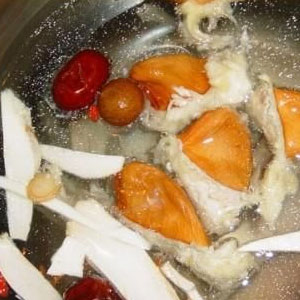 2、一起與生姜放進(jìn)瓦煲內(nèi),加入清水適量,用大火煲沸后改為文火煲至2小時。調(diào)入適量的食鹽和少許生油即可。
