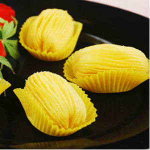 做法:把面粉、豬油和成油心,面粉內(nèi)放入水、糖,和勻,搓至成水皮;把水皮包住油心,捏緊收口包好、壓角搟開、卷成筒狀,再壓扁卷起,搟成圓形包起榴蓮肉,捏成雀籠形,用剪刀把表面剪出尖形,放入160℃的油鍋中炸至金黃色即可。