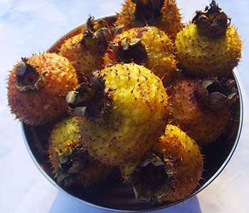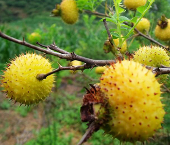 刺梨子的果實(shí)是扁扁的球形,8、9月份成熟,果實(shí)是黃色的,有時(shí)又帶一些紅暈的,而且果皮上長(zhǎng)著不少小肉刺,“刺梨”這個(gè)名字就是這么得來(lái)的。