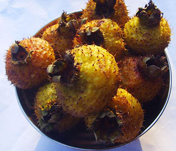 野刺梨的果皮呈現(xiàn)黃色,而且果皮上長(zhǎng)滿了密密麻麻的肉刺,于是當(dāng)?shù)厝藗兙桶阉Q為“刺梨”。野刺梨披著一層重重的盔甲,剖開之后里面是黃色果肉,吃起來酸甜可口,汁液豐富,是一種野外適合解渴的水果。