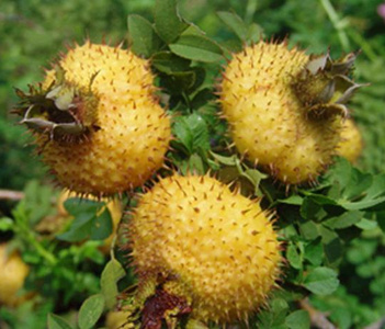 刺梨是滋補(bǔ)健身的營養(yǎng)珍果,它的收獲期不足30天。果實(shí)多為扁圓球形,橫徑一般為二至四厘米,八至九月果實(shí)成熟,黃色,有時(shí)帶紅暈。果肉脆,成熟后有濃芳香味。果皮上密生小肉刺,俗稱之為“刺梨”。