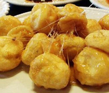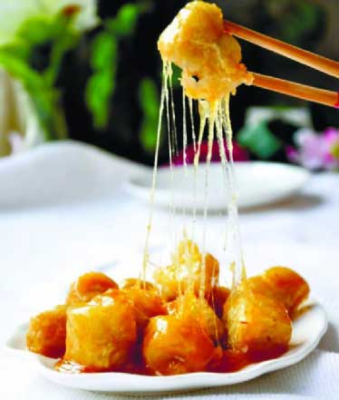 拔絲香蕉是以香蕉、糖、雞蛋為主要食材的漢族傳統(tǒng)名菜,屬魯菜系。菜品外脆里嫩,甜糯可口。色澤淺黃微亮,質(zhì)地柔軟鮮嫩,吃時(shí)蘸水拔絲,香甜可口沁心。山東是拔絲菜的發(fā)祥地,著名菜肴還有拔絲蘋果、拔絲山藥、拔絲紅薯、拔絲金棗、拔絲櫻桃、拔絲香蕉等。