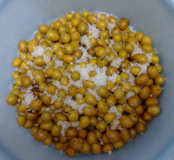 2 把剪好的黃皮裹上薄薄的一層鹽,不用太多。之后把它放上一夜,期間要翻一翻,把底下的翻上來。