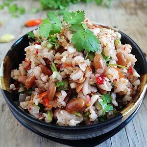 材料:芭蕉花1棵、豬肉200克、朝天椒6個(gè)、韭菜適量、香菜適量、色拉油2大勺、食鹽4克、雞粉2克、蔥5克、姜5克、生抽5克、香油適量