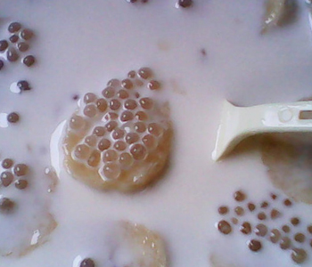 4、 加入1瓶牛奶和冰鎮(zhèn)好的西米煮開后放入預先切好的香蕉粒后再煮開馬上關(guān)火,裝起;