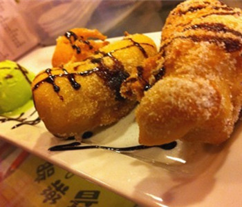2、鍋內(nèi)倒入油,燒熱,將香蕉逐個(gè)掛上糊后放入炸成金黃色,待香蕉浮起后,撈起瀝油;