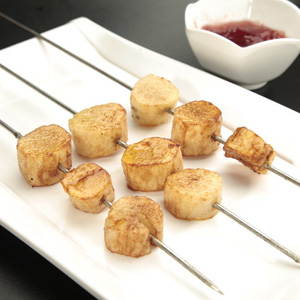 1、選熟的、個頭不太大的香蕉剝皮后美觀地擺放在瓷碟中(個頭大的分成兩三份);
