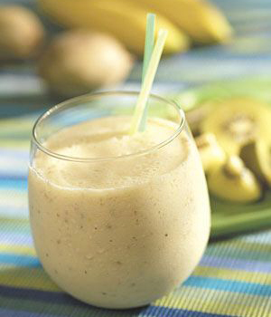 材料:1熟透的香蕉、1湯匙糖、2/3杯冷牛奶、幾粒鹽