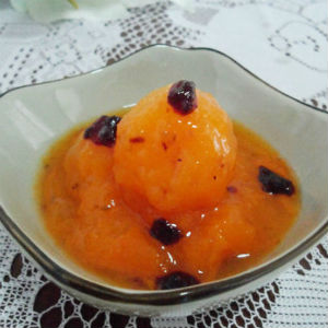 6、若嫌單調,也可以把剝掉外皮的柿子果肉放在杯子里,淋入少許藍莓果醬做點綴。