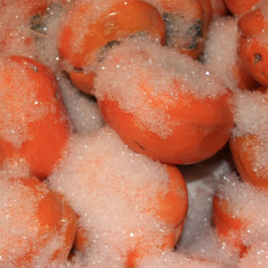 4、吃的時候拿出來,放置一會后,凍柿子的表面會有一層薄薄的白霜。
