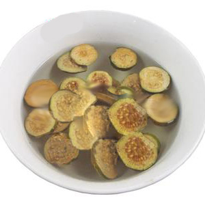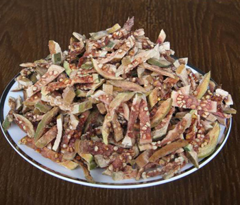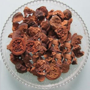 將野生番石榴未成熟的幼果進(jìn)行干燥處理,然后切成片。鮮時為青綠色,干者呈現(xiàn)黑褐色;表面稍粗糙堅硬,頂端有宿存的花萼及殘存花柱。果肉堅硬,淺棕色,5室,有多數(shù)種子密集鑲嵌于內(nèi);種子灰褐色,大如綠豆,呈不規(guī)則之扁圓形或三角形,味微酸而澀,氣微香,以飽滿、堅實(shí)者為佳。