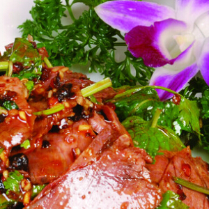 3.炒鍋內(nèi)放人熟豬油,燒至八成熱,下入冬筍、泡菜和紅辣椒炒幾下,倒人狗肉原湯燒開,放人味精、青蒜,用濕淀粉調(diào)勻勾芡,淋入芝麻油和醋,澆蓋在狗肉上,周圍拼上香菜即成。
