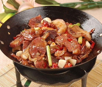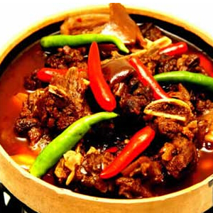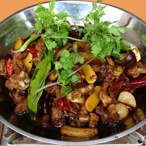 制法:將狗肉切成4厘米見方塊,用清水漂洗2次,控干水分,將薄荷洗凈,摘取嫩尖。炒鍋上火,注入菜子油,燒至7成熟,下草果、大料、花椒、白糖、鹽、干辣椒段、蔥、姜、醬油,下狗肉煸炒20分鐘,注入肉湯,燒開后倒入砂鍋。將沙鍋上火,把白酒分兩次加入,改用小火,燜約1小時,湯汁收稠時,放上薄荷,連同沙鍋上桌。