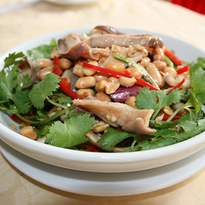 材料:豬肚3個、紅青椒各1只、蔥、姜、蒜、香菜適量。