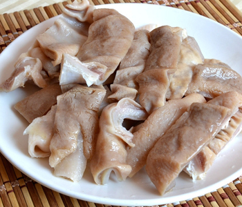 7、經(jīng)過一熱一冷的沖洗,豬肚表面的白膜就很容易用刀刮除了。