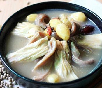 1、用堿法:將豬肚用少許食用堿反復(fù)搓洗,再放入沸水鍋內(nèi)氽燙。