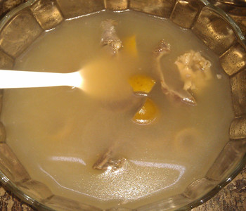 (3)在鍋里加入適量的水,先把青橄欖放下去燉半個(gè)鐘,再下豬心大火煮沸后小火慢慢燉一個(gè)半鐘就可以了。