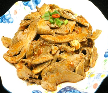 2、豬心洗凈對半剖開,再切成薄片,放入碗內(nèi)。然后加適量鹽、醬油、糖、酒、味精、淀粉、水拌勻腌一下待用。