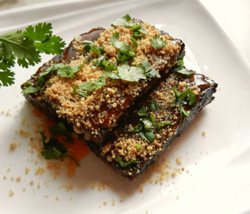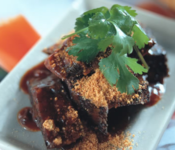 6、將豬血糕切成長(zhǎng)條狀,以竹簽穿過(guò),放入蒸籠內(nèi)蒸約5分鐘至熟,蒸好的豬血糕先沾醬油膏再沾甜辣醬后,拌入花生粉與香菜即可。