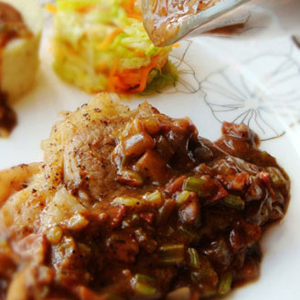 材料:大蒜頭,生姜,洋蔥,番茄醬,黑胡椒,香草,生粉,雞精,料酒,水