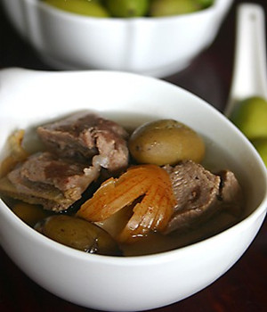 (3)在鍋里加入適量的水,先把青橄欖放下去燉半個鐘,再下豬心大火煮沸后小火慢慢燉一個半鐘就可以了,可以不加鹽。