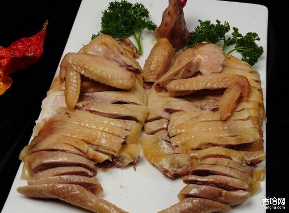 用老湯(即經(jīng)常煮白水雞的湯)加清水,還有調(diào)料包,把母雞放入鍋內(nèi),先用旺火燒開,再用文火慢燉。待雞肉煮熟(以能用筷子扎進雞肉為宜),撈出晾涼,再取雞油抹遍全身,使雞皮發(fā)亮。吃時將熟雞帶骨剁成5厘米方塊,碼在盤里,配上三花油一小碟上桌??瓷先ド珴牲S亮,聞起來清香撲鼻,吃起來味道醇厚,鮮嫩爽口。