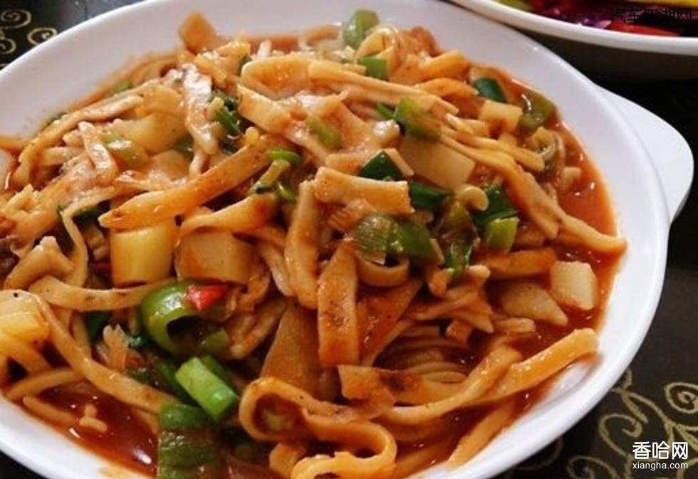 制法:面粉加堿和成較硬的面團,稍餳后揉勻,再搟成薄餅,放入餅鍋中烙至半熟,取出后切成長條。燜炒:燜炒時,炒勺里放適量植物油,先將羊肉絲煸炒至肉色變白,再依次放進豆腐條、干辣椒片等料和幾勺羊肉湯。燒開后,將切好的餅條抖散放進勺內(nèi),蓋上蓋子。燜至餅條熟透,再撒上蒜苗終一即成。