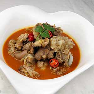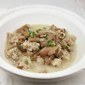 2、燒鑊下油,放入所有料頭起鑊,再放豬紅、豬骨髓,烹酒落二湯調(diào)入所有味料略煮,用濕粉打芡,加入麻油后倒入瓦煲,再放上火爐煲熱,上面放芫荽即成。