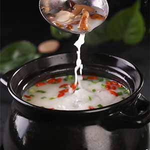 3、開鍋,燒開雞湯,下姜片、蒜頭,滾開后下枸杞、少許花生油和豬骨髓滾開,最后以鹽調(diào)味便成。