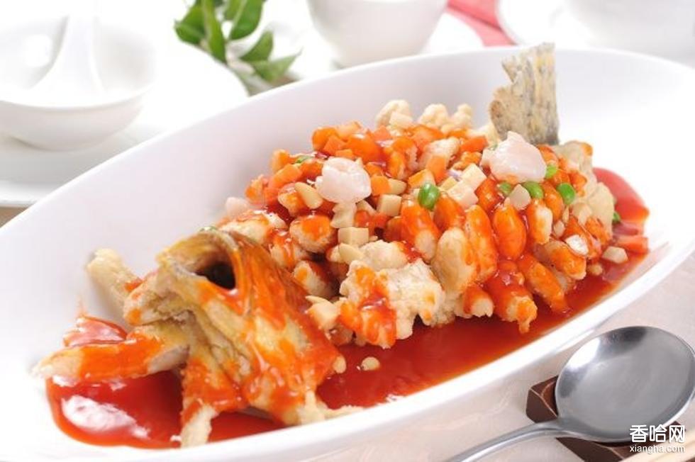 2、取出湟魚,瀝干水分,用濃團(tuán)粉糊拍面,入寬油中,以文火炸成金黃褐色,層次凸凹?jí)緣荆q如松鼠狀,撈出裝盤,澆上白糖、醋、胡椒、辣面、姜粉等佐料制成的汁液即可。