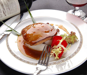 材料:大石斑肉750克、鵝肝醬適量、姜片5克、洋蔥5克、蔥白段5克、花生油20克