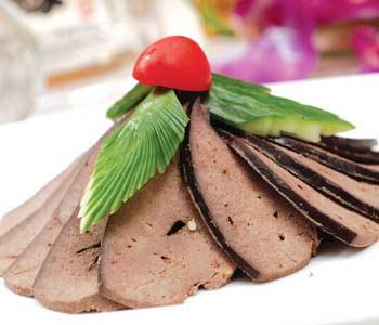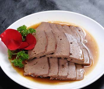 3、離火,放入豬肝焐至斷生(切開不見血水),冷卻,浸泡,食用時(shí)切片裝盤即可。