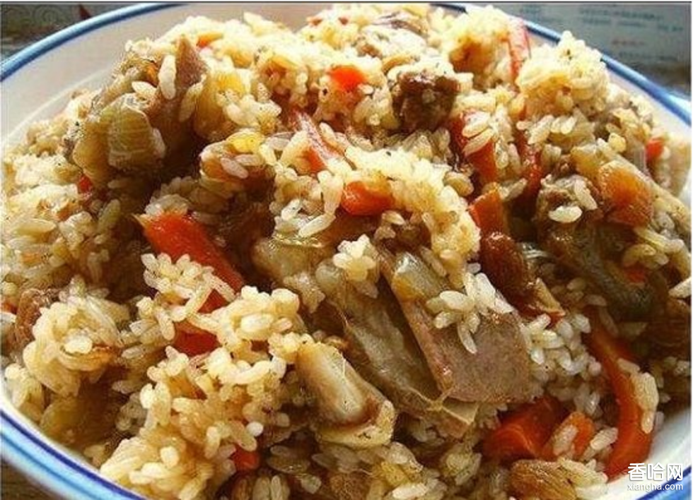 手抓飯是新疆維吾爾族菜品,主要的原料是用新鮮羊肉,胡蘿卜、洋蔥、清油、羊油和大米。做法是先將羊肉剁成小塊用清油炸,然后再放洋蔥和胡蘿卜在鍋里炒,并酌情放些鹽加水,等二十分鐘后,再把洗泡好的大米放入鍋內(nèi),不要攪動(dòng),四十分鐘后,抓飯即熟。做熟的抓飯油亮生輝。味香可口。維吾爾族把抓飯視為上等美餐。