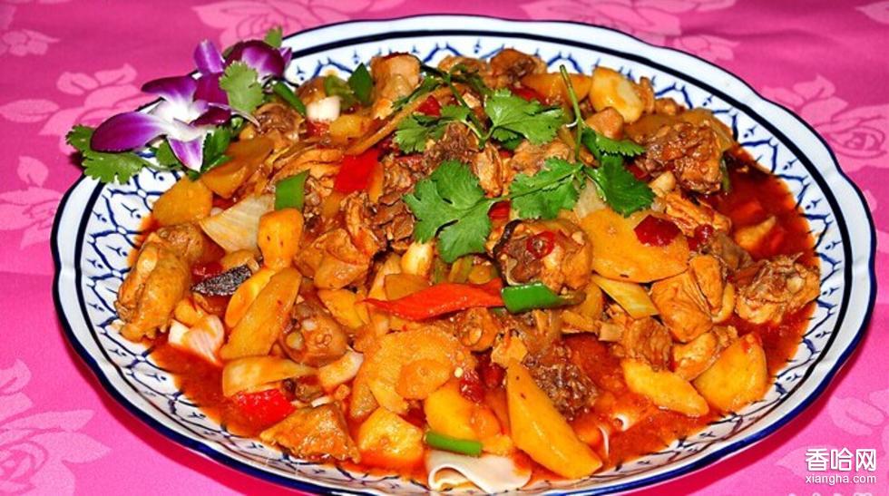 新疆大盤雞是新疆地區(qū)名菜,大約起源于80年代后期,主要用料為雞塊和土豆塊,配皮帶面烹飪而成。新疆大盤雞色彩鮮艷,有爽滑麻辣的雞肉和軟糯甜潤(rùn)的土豆,辣中有香,粗中帶細(xì),而且經(jīng)濟(jì)實(shí)惠,親朋聚會(huì)食用尚家。