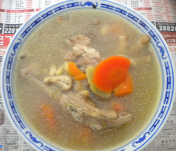 3、鍋內(nèi)放水,用旺火燒開(kāi),放入以上各用料再燒,慢火煮3小時(shí),視豬骨、雞腳酥爛時(shí)下精鹽調(diào)味即成。