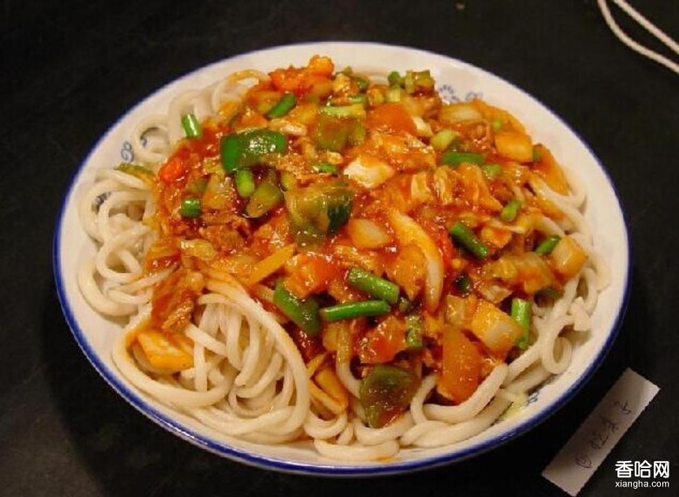 過油肉拌面是在我國新疆具有民族風(fēng)味的維族、回族面食,色澤鮮亮,湯口紅油,面條筋道,有濃郁的番茄和羊肉的香氣。原料為羊肉、西紅柿、鮮辣子、洋蔥、大蒜、干紅辣椒、花椒、芹菜、茄子、 豆角、姜豆、圓白菜、鹽、醬油、白糖、番茄醬等。