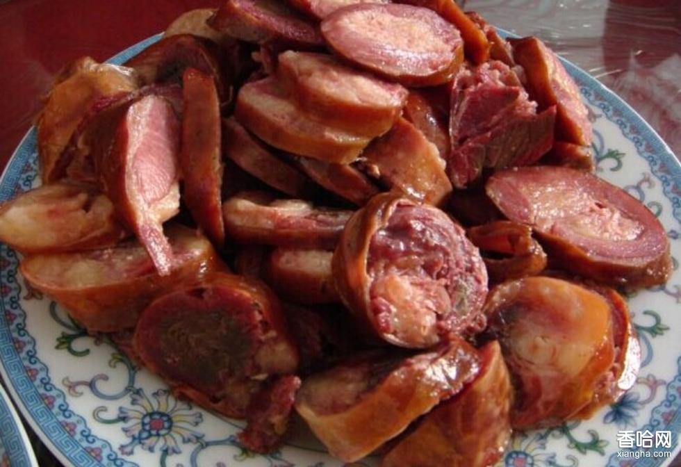 ②熏馬腸:熏馬腸更是一絕,馬的精華在于馬肋骨,新鮮馬肉連同馬肋骨一起裝入韌性最好的馬腸,紅柳枝煙熏,呈煙熏色,極品中的極品。嘗一口,咀嚼1分鐘以上越嚼越香。