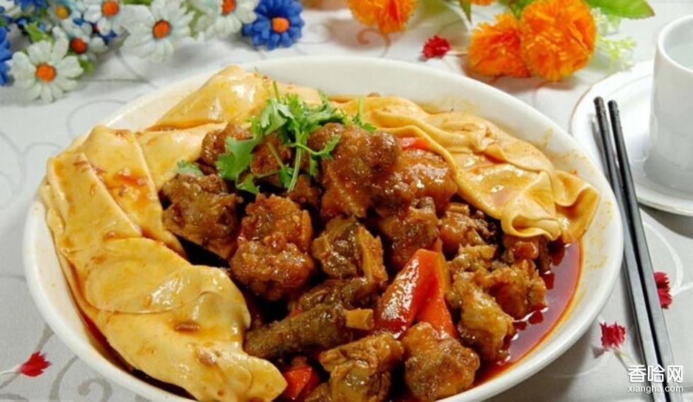 羊肉燜餅,將少數(shù)民族最喜愛的肥美羊排投以鮮姜、蔥紅燒,再將手工撕制而成的薄如窗戶紙的薄餅鋪到羊排上加蓋,靠蒸氣燜熟,切條與羊排一起裝盤。中原飲食文化與西域飲食文化相互浸潤體現(xiàn)在巴里坤飲食的方方面面。這里特有的羊肉燜餅是極佳例證,巴里坤羊肉燜餅現(xiàn)已成為聞名遐邇的新疆名小吃之一。
