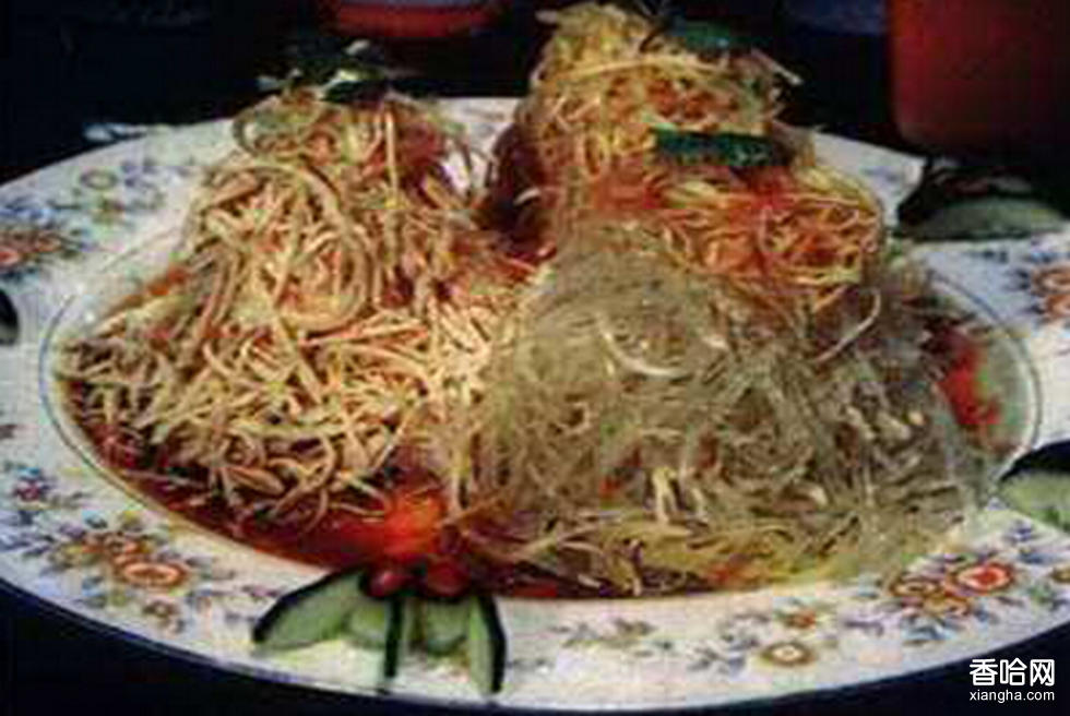 駝峰炒五絲是河西地區(qū)又一著名的傳統(tǒng)佳肴。遠在唐代,它已是楊貴妃姊妹的盤中珍饈,以肉質油嫩、豐腴肥美而聞名。駝峰炒五絲選料考究,刀工精細。以駝峰為主料,并配以玉蘭片、冬茹、韭黃、火腿和雞脯肉“五絲”炒成。如果掌握好火候,則菜肴色香味形俱佳。