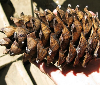 松子是由松塔脫粒而成,這就是松塔。這是松子加工的第一步,這一步?jīng)]法摻假。大家如果不放心,可以在市場(chǎng)上購(gòu)買(mǎi)這種生的松子。回家放入微波爐中加熱一下就行。